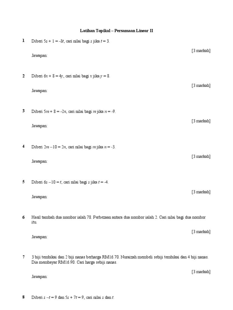 Latihan Topikal Persamaan Linear Ii Pdf